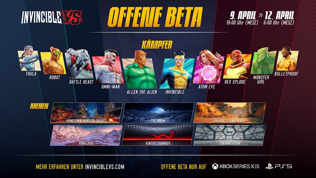 Die Invincible VS Open Beta ist ab Donnerstag, den 9. April, um 19:00 Uhr bis Sonntag, den 12. April, um 06:00 Uhr verfügbar. Spieler können auf Xbox Series X|S und PlayStation 5 auf die Open Beta zugreifen.