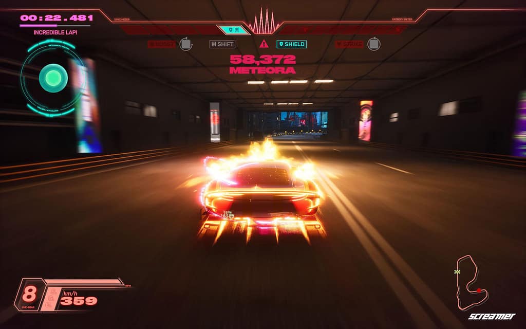 Neben der Kampagne bietet Screamer eine Vielzahl unterschiedlicher Spielmodi. In Teamrennen können Spieler:innen mit ein oder zwei Charakteren antreten, wobei nicht nur die Platzierung, sondern auch erzielte K.-o.s in die Gesamtwertung einfließen und taktische Zusammenarbeit belohnen. Die Overdrive-Herausforderung setzt von Beginn an auf maximale Leistung, bei der ein einziger Fehler das sofortige Aus bedeuten kann. In der Score Challenge stehen Punktejagd und riskante Manöver im Vordergrund, während klassische Arcade-Modi wie Time Attack, Checkpoint-Rennen und Old-School-Herausforderungen präzise Linienwahl und kompromisslose Geschwindigkeit verlangen. Zusätzlich erlaubt ein frei konfigurierbarer Rennmodus umfangreiche Anpassungen an Regeln und Gameplay.